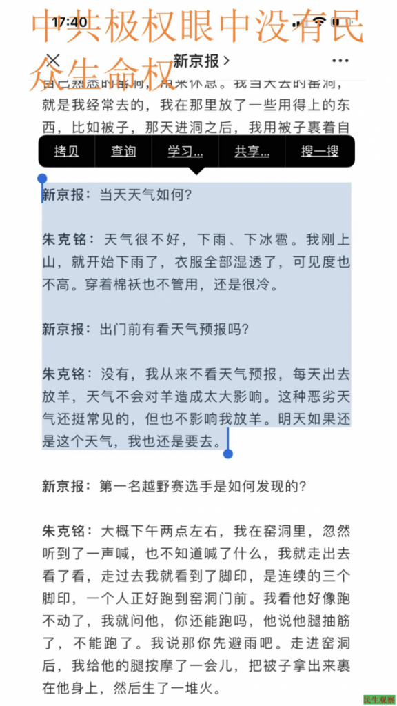 从官媒统一的口径反映,该次赛跑死亡事件肇因是极端天气,而事实上从当天营救6名参赛者的牧羊人朱克铭详述,这种所谓的极端天气是这个时期当地的气候常态,没有什么特别之处。朱克铭在接受采访时的原话是:“这种天气是经常出现的”,“经常有这样(严重极端天气)的情况啊”。可见中共当局意欲将重大赛事死亡事件让极端憋气来背锅,以掩盖无视民命,没有对本次赛事生命安全保护救助的实质。