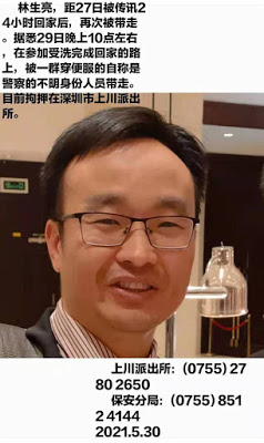 (维权网信息中心报道)2021年5月30日,本网获悉:深圳公民林生亮 2021年5月29日晚上10点左右,其受洗后,从教会回家的路上被便衣带走,在深圳市上川派出所传唤。直到今天晚上7点多才释放。林生亮称:已于2021年5月30日晚上7:00多钟到家,传唤近24小时,被带走的理由是,深圳警察不允许他对郭富坤在深圳市宝安区看守所非正常死亡案发声。