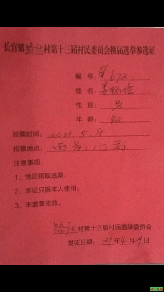 2021年5月8日,姜怀俭作为一个持有“参选证”的选民,出现在长官镇人民政府路庄村“村委会换届选举”活动现场,即:西花门前。整个过程,姜怀俭发现了:本次选举严重舞弊。