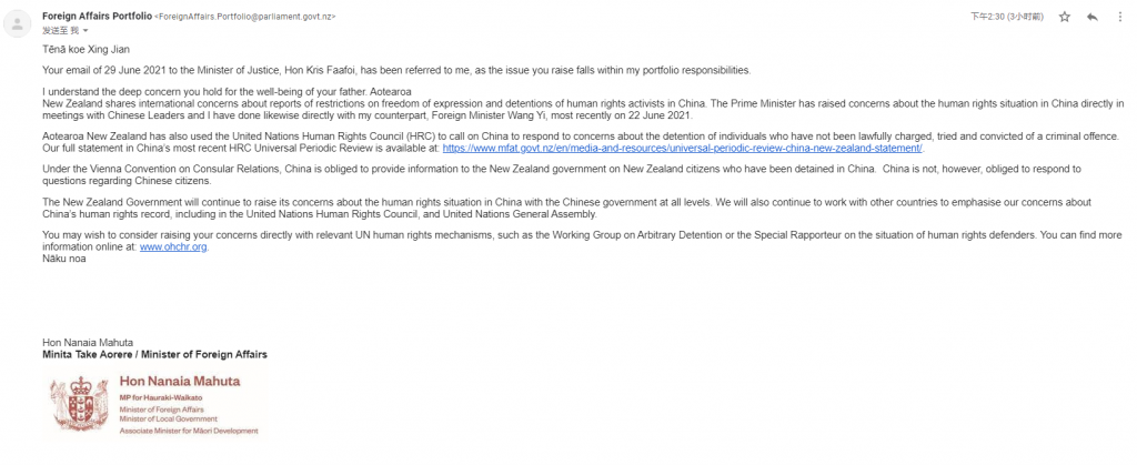 我理解你对你父亲的安康深切关注。新西兰与国际社会一样,对中国限制言论自由和拘留人权活动人士的报道表示关切。总理在与中国领导人会晤时直接表达了对中国人权状况的担忧,最近一次是在 2021 年 6 月 22 日,我也直接与我的同行王毅外长进行了同样的讨论。