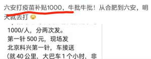 比如,安徽去南京拉人打疫苗,每人补贴400元,也有的补贴1000元。湖北到深圳拉人头打疫苗,每人补贴800元。为遏止跨区抢人打疫苗,河北武安市祭出检举奖金500元,鼓励民众举报。安徽绩溪县也发紧急通告称,凡是拉人到邻县去接种的,一律从严从重处罚。