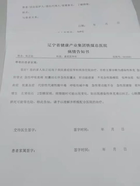 2021年9月25日,本网获悉:被以“寻衅滋事罪”判刑两年半的辽宁丹东冤民张正廷,在还有38天就将获得释放的今天,被狱方送到辽宁省健康产业集团煤铁总医院抢救,医院的病危通知书上说是胆管炎,目前已上呼吸机,其爱人宋玉洁只能守候在抢救室外,乞求上苍能佑护77岁的丈夫渡过这生死一劫。