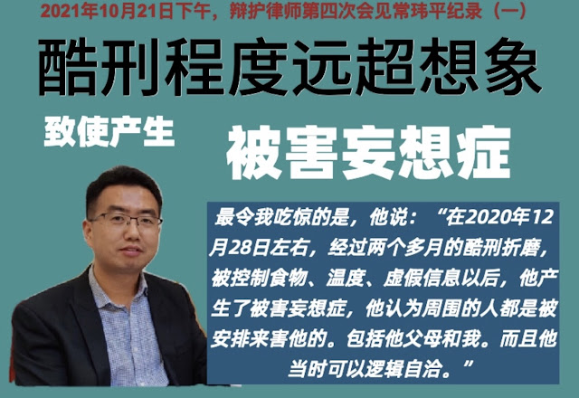 最令我吃惊的是,他说:“在2020年12月28日左右,经过两个多月的酷刑折磨,被控制食物、温度、虚假信息以后,他产生了被害妄想症,他认为周围的人都是被安排来害他的。包括他父母和我。而且他当时可以逻辑自洽。”