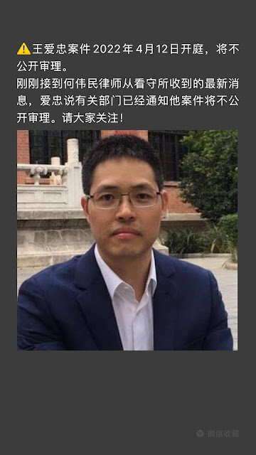 王贺楠(王爱忠妻子)2月17日通报说:“王爱忠案件2022年4月12日开庭,将不公开审理。刚刚接到何伟民律师从看守所收到的最新消息,爱忠说有关部门已经通知他案件将不公开审理。”