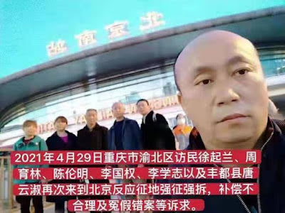 2021年4月17日,曾因与维权访民姜祥平等多人集体到北京信访,共同反映重庆市渝北区强拆私房、非法暴力征地、股权纠纷以及公安不作为等要求,4月20日,随与姜祥平被渝北区龙兴镇维稳人员截访,并于次日被遣返原籍;