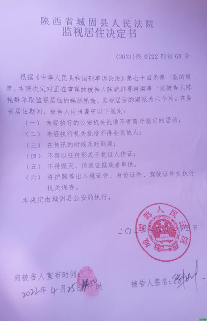 2022年4月27日,本网获悉:陕西城固维权人士陈艳群被迫害案第二次开庭,未宣判。开完庭后,城固县法院决定继续对陈艳群监视居住。