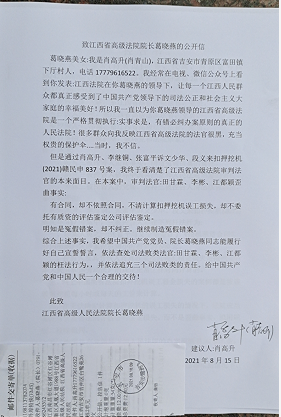 2021年8月16日,本网获悉:在一审、二审法院连续枉法裁判,向省高院申请再审得不到纠正的情况下,知名维权人士肖青山今天以美女的称呼,向江西省高级人民法院院长葛晓燕致公开信,要求履行承诺,依法查处枉法裁判的司法人员。