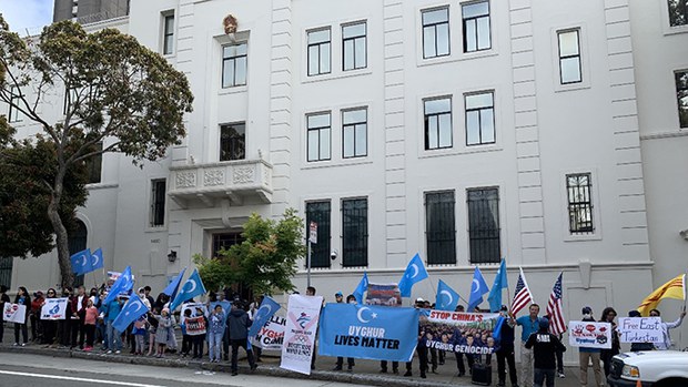 2021年7月5日上午11时,以维吾尔人为主的示威者在旧金山中领馆正门外聚集。 …