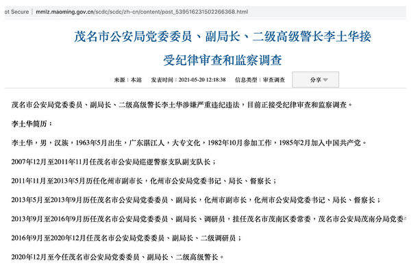 广东茂名市公安局副局长、二级高级警长李土华被调查。(网页截图) 【大纪元2021…