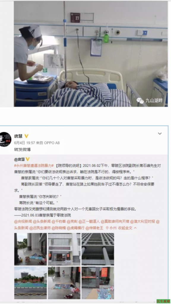 【民生观察2021年6月7日消息】近日,湖南永州上访妈妈唐慧到零陵区人民法院办事…