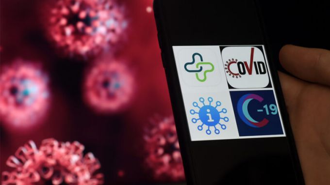 图为一部智能手机上显示的中共病毒(COVID-19)跟踪应用程序的徽标。(OLI…