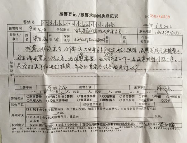 早在本月20日,梁白端报警,南街派出所公安出警后,把当天的2名不明身份人员带进派出所作笔录,并给了梁编号350264509的《接警登记》。登记载:梁白端悉重点上访人员,为维稳需要,政府南街街道工作人员正常执行维稳工作,民警对其身份进行核实,并告知其要合法合规进行工作。