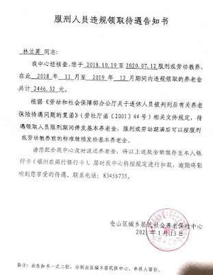 2021年7月29日,本网获悉:福州维权人士林兰英已于日前向鼓楼区法院提交了,其起诉仓山区城乡居民社会养老保险中心违法,要求退还养老金的《行政起诉状》。
