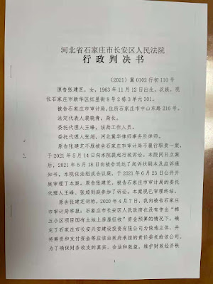 2021年8月11日,本网获悉:2021年8月9日,石家庄市维权人士张建芝通过邮寄向石家庄市中级人民法院邮寄行政上诉状,请求依法撤销河北省石家庄市长安区人民法院(2021)冀0102行初110号行政判决,责令长安区人民法院继续审理。