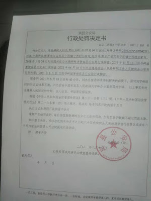 在今年“七一”建党百年前夕,宾县公安局曾以刘杰在今年5月12日到检察院辱骂工作人员为由,以“寻衅滋事”对刘杰作出行政拘留7天的处罚。今年8月2日,刘杰再次去北京上访,在北京拦截了国家信访局大局长李文章的车,由地方上20多人组团接回了宾县,然后说疫情需要隔离,由俩人一班轮流看管,于昨天以“寻衅滋事”为由,作出行政拘留15天的处罚。