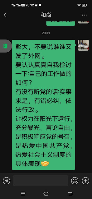 在肖青山在回复国保彭大的微信内容可见看出,其显然对习近平党中央所承诺的“依法治国”是拥护的,也是认真的。那么问题来了,是习近平党中央的“依法治国”本来就是口是心非,还是地方官僚用阳奉阴违来让民众感受习近平党中央是口是心非呢?