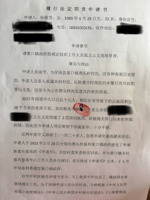 然而目前半年已过,没有任何进展。日前,张依据国内相关法律向县镇两级政府提交相关履职申请,希望地方当局能切实做些实事,急老百姓之所急,推进张丽芳的宅基地审批事宜。