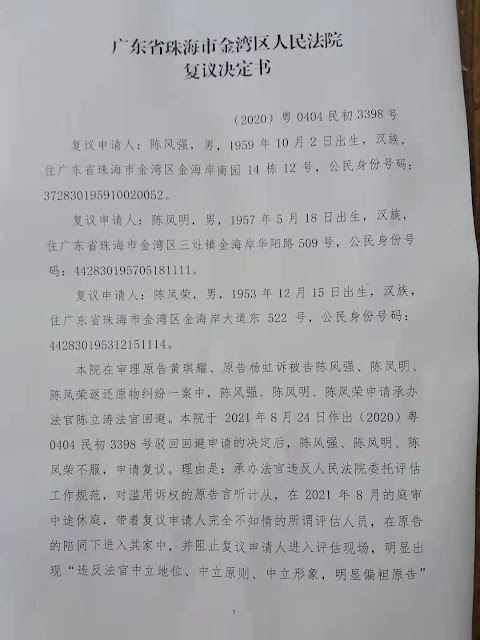 伤残军人陈风强及其两位兄长陈凤明、陈凤荣因“返回原物纠纷”一案中,审判长陈立涛在审理中明显出现枉法裁判倾向,于2021年8月23日到金湾区法院提交了书面的回避申请。该院院长居然袒护下属,第三天就作出了驳回的决定。陈氏弟兄不服,于2021年9月1日由陈凤明、陈凤荣弟兄俩到金湾区法院提交复议。