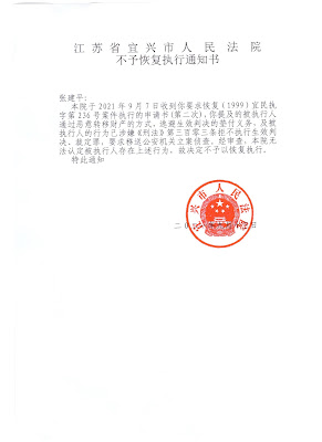 2021年9月18日,本网获悉:昨天(9月17日),维权人士张建平收到江苏省宜兴市法院邮寄送达的“不予恢复执行通知书”,对张建平先生提供的、由该法院自获取的被执行人可供执行财产信息,却以“本院无法认定”为由拒绝采取措施执行,协助被执行人继续“躺赢”。
