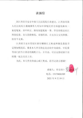 2021年9月20日,本网获悉:被以“滥伐林木罪”判刑三年六个月而一直在伸冤的曾名仰,因不满吉安市中级法院院长与江西省高级法院院长的不作为,多次向纪委监察委、及组织部控告,见曾名仰屡告屡败,其所在的新圩镇领导告知曾名仰应该去北京。对此,曾名仰以“表扬信”方式表达感谢。