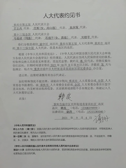 重庆韩良多年来坚持宣传抗战历史,致力推动自由民主,却被多次拘留,判刑三年半,最近疑遭官方指使殴打受伤。为此本人受韩良委托,发起三次约见人大代表,并首次约见全国人大代表。本次约见文件附后。现上网公示!
