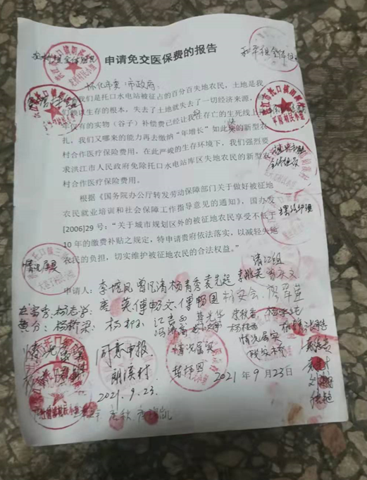 从他们发在网上的申请免交医保费的报告可以看到涉及托口水库移民的多个乡村朗溪村、三里坪等多个乡村组基层组织都被动员与说服,盖章支持托口水库维权移民的正当诉求,这也涉及到这些乡村基层人员的权益保障,他们也意识到中共当局在利用他们维稳并强征移民房屋土地后并没有落实国家政策依法给水库移民的基本保障与权益。