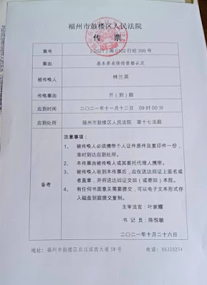 2021年10月29日,本网获悉:福州维权人士林兰英刚刚收到鼓楼区法院(2021)闽0102行初399号《传票》:林诉仓山区城乡居民社会养老保险中心违法要求退还养老案,将于11月12日在十七法庭公开开庭审理。