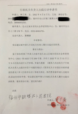 福州维权人士林兰英向鼓楼法院提交案件相关申请书 2021年11月2日 公民权利网编辑维权动态 2021年10月31日,本网获悉:今日福州维权人士林兰英向鼓楼区法院提交了关于“(2021)闽0102行初399号即其起诉仓山区城乡居民社会养老保险中心违法要求退还养老金案”的两份法律文书: 1.《行政机关负责人出庭应诉申请书》,林认为仓山社保中心负责人应履行出庭应诉的职责; 2.《调换大法庭申请书》,林的亲朋好友众多,且非常气愤当局违法剥夺林的养老金,都表示要前往鼓楼法院旁听本案的庭审,林认为17法庭太小,特申请换一个大法庭。 本网将持续关注此案进展。 来源:维权网 请分享这个故事: