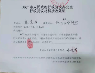 2021年11月16日,本网获悉:今天,河南省郑州市中原区宋庄村民宋会春向郑州市人民政府提交了行政复议申请书,请求确认郑州市审计局对宋会春请求审计的要求置之不理的行政行为违法;责令其对审计请求作出处置。郑州市政府当场予以受理。