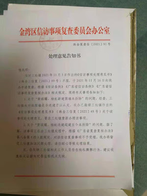 2021年12月3日,本网获悉:昨天,广东伤残军人陈风强收到了珠海市金湾区政府信访事项复查委员会作出的珠金复查告[2021]91号处理意见告知书,该处理意见撤销了三灶镇政府对女警杨虹违法建筑的“死缓”处理意见,明确对该违法建筑进入监督执行程序,等于对女警杨虹的违法建筑进入“秋后问斩”。