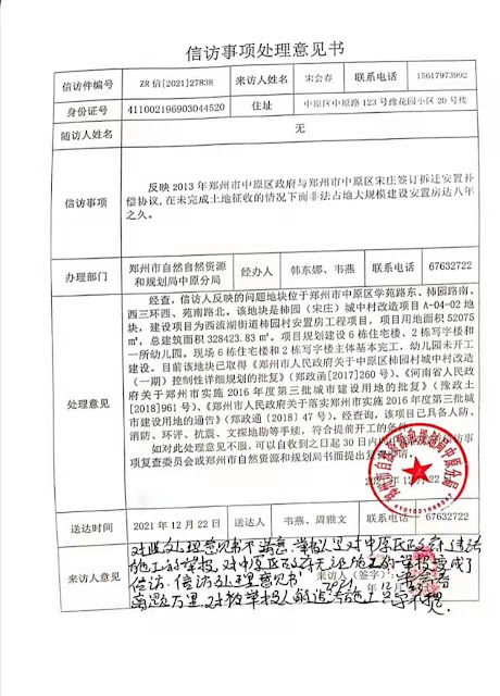 2021年12月23日,本网获悉:今天下午三点半,郑州市自然资源和规划局中原分局(简称中原自规分局)当面向中原区宋庄村民宋会春送达《信访事项处理意见书》(简称《意见书》),载明:“经查,信访人反块的问题地块位于郑州市中原区学苑路东、柿园路南西三环西、苑南路北。该地块是柿园(宋庄)城中村改造项目A-04-02块,建设项目为西流湖街道柿园村安置房工程项目,项目用地面积52075㎡,总建筑面积328423.83m……经查询,该项目已具备人消防、环评、抗震、文探地勘等手续,符合提前开工的要件。”