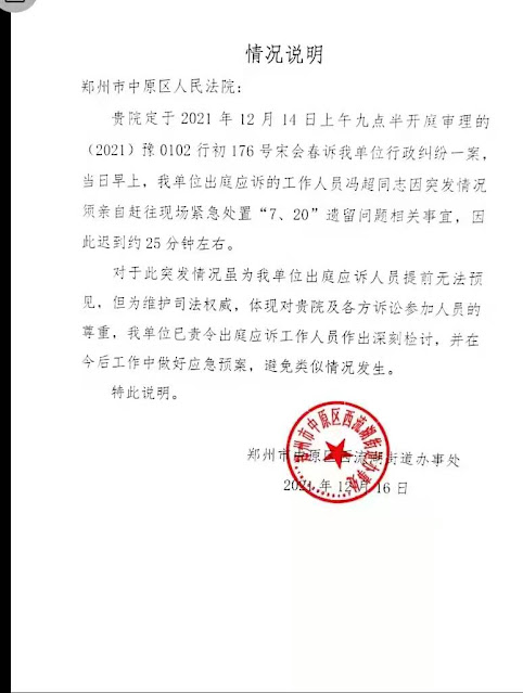 2021年12月30日,本网获悉:2021年12月29日,郑州市中原区人民法院通知宋会春到该院查阅郑州中原区西流湖街道提交的《情况说明》,但该《情况说明》充满了谎言,且越描越黑。