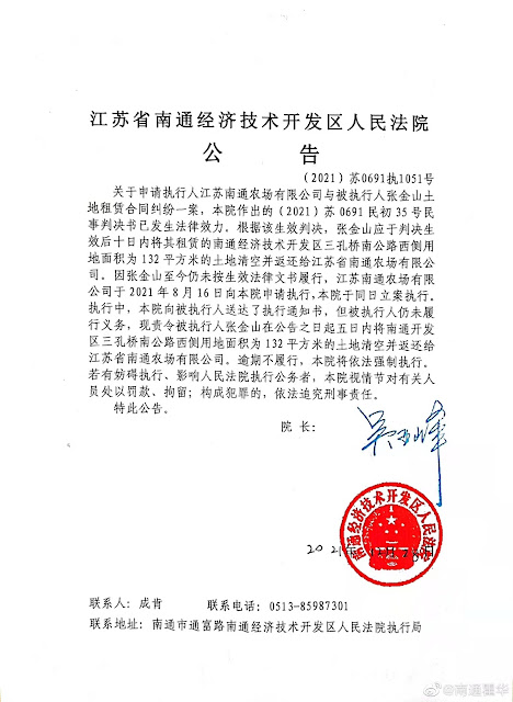 2022年1月3日,本网获悉:2022年元旦前夕,即2021年12月28日,江苏省南通经济技术开发区人民法院发布了(2021)苏0691执1051号《公告》,载明“……现责令被执行人张金山在公告之日起五日内将南通开发区三孔桥南公路西侧用地面积为132平方米的土地清空并返还给江苏省南通农场有限公司。逾期不履行,本院将依法强制执行。若有妨碍执行、影响人民法院执行公务者,本院视情节对有关人员处以罚款、拘留;构成犯罪的,依法追究刑事责任”并盖有该院院长吴玉峰的大印。