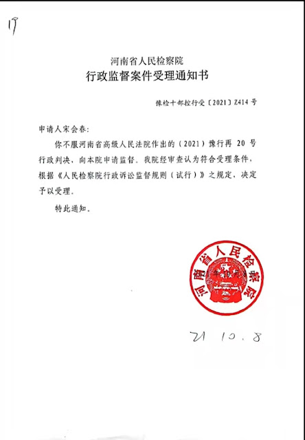 2022年1月24日,本网获悉:今天,河南郑州中原区宋庄村村民宋会春通过邮寄向河南省人民检察院提交新证据,一并提交证据说明及其意见书。该新证据名称为《关于反映中原区柿园村安置房改造项目未取得施工许可证的调查情况回复》(简称《回复》)。该《回复》郑州市中原区城市综合执法局于2022年1月12日作出,其内容足以推翻河南省高院作出的(2021)豫行再20号行政判决。