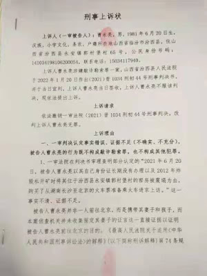 在曹永亮的上诉状中,针对汾西县法院仅仅以永安镇镇长乔军华一人的证人证言定罪,表示不服,因为乔军华作为被害人的法人代表,其证人证言在没有旁证的情况下,不具有法律上的证明效力。另外,2021年8月16日,曹永亮是带着妻子和孩子一起去北京的,也没有上访行为,公检法统一认定是曹永亮一个人去北京上访,完全属于“一条龙”构陷性质的办案。