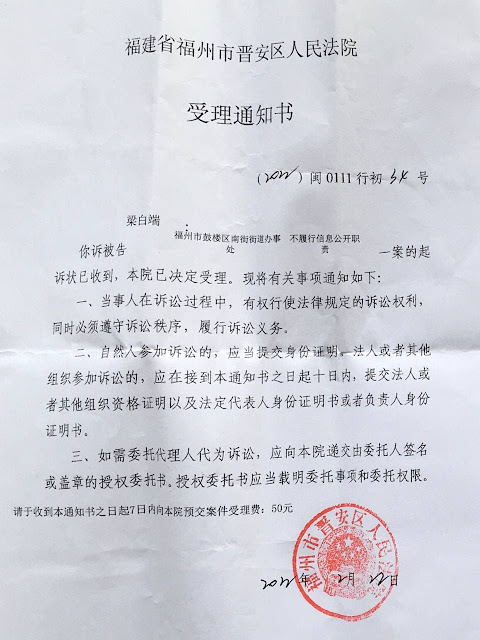 2022年3月8日,本网获悉:福州残障维权人士梁白端向晋安区法院起诉鼓楼区南街街道办事处,在法定期限内不履行信息公开法定职责违法已立案。