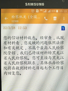 卢廷阁律师:最高检察院竟然踢歪了!——我在会理法院被打事件维权第43步之进展(2022年3月10日) 2022年3月12日 公民权利网编辑维权动态 为坚持追究四川省会理县法院邱云、杨继兰2个法官非法搜查的刑事责任,2月21日,我与黎雄兵律师继续向最高检察院申请抗诉。之前,我们已向下级法院、检察院自诉、上诉、申诉、申请抗诉过,均没有公正结果或不理会。这次,最高检收到申请后,不是依法受理抗诉,而是把我们象皮球一样踢走,踢也应踢到四川啊?一下踢到了黑龙江!莫非是异地管辖?可黑龙江也没有在7日内回复我啊?哈哈哈哈😄看来,最高检也不过而而! 附:短信通知等 来源:维权网 请分享这个故事: