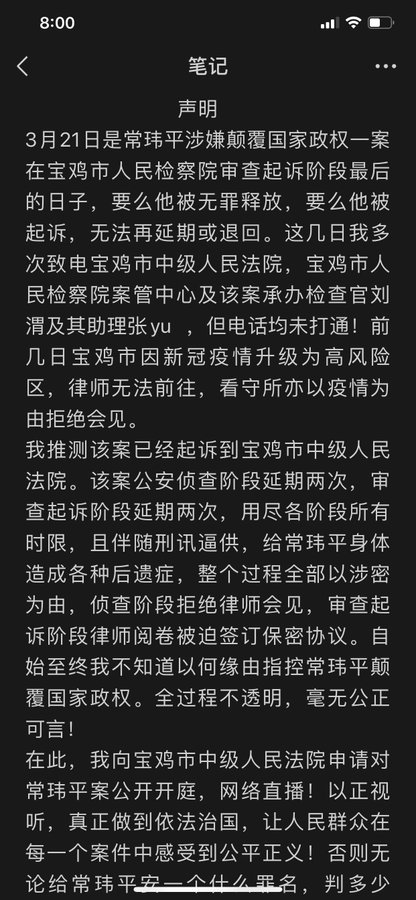 常玮平律师的妻子陈紫娟:请宝鸡市中级人民法院公开网络直播庭审常玮平涉嫌颠覆国家政权一案!