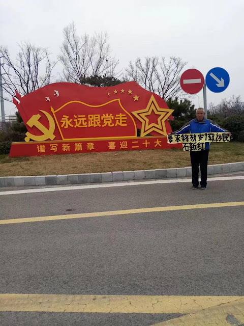 吴继新呼吁当局释放的石新红,是安徽省蚌埠市固镇县石湖乡人,2003年12月,石新红家的两处门面房被当局联合起来抢走,石新红和父亲石兆达被赶出石湖乡被迫上访,而石兆达客死到他乡,也没有要回自己的房子。石新红为替父伸冤,在北京边上访、边打工,2022年3月14日在北京大兴区大兴桥东黄马路劳动市场等活时,被截访人员抓回去刑拘关押看守所至今。