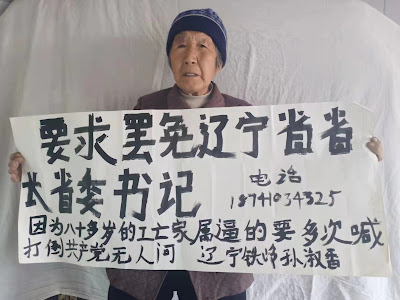 2022年5月8日,本网获悉:今年已经84岁的辽宁铁岭调兵山市晓明镇娘娘庙村的孙淑香,因丈夫的工亡50年得不到依法赔偿,上访还屡遭打击报复,在今年全国“两会”期间举牌要求罢免省委书记与省长后,今又举牌喊出要打倒共产党。