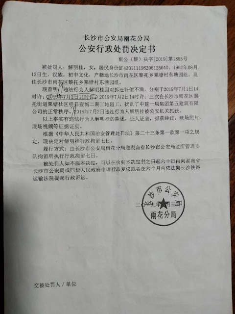 2022年5月17日,本网获悉:解明桂是长沙市雨花区黎托街道粟塘社区东塘元组村民。因依法维权被地方当局以三次在黎托街道粟塘社区明昇壹城二期工地阻工、扰乱中建一局集团第五建筑公司正常秩序为由,于2019年7月2日被当地警方拘留七日(共8日),于2019年7月10日解除拘留回家。