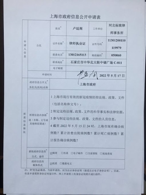 卢廷阁律师:向北京、上海申请公开:疫情防控的法律依据(2022年5月17日) 2022年5月18日 公民权利网编辑维权动态 继上海之后,北京又开始严厉防控。据卫健委公布的疫情数据,新冠病毒几经变异后,已远没有爆发时那么致命,但为何还要严厉防控? 在防控什么? 法律依据呢? “为人民服务”的政府,理应依法行政,否则,“全面依法治国”岂不伦为笑话? 附:申请 来源:维权网 请分享这个故事: