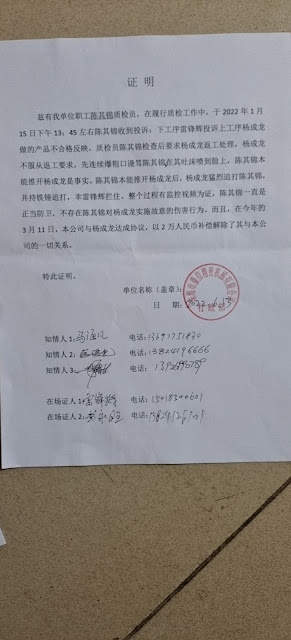 2022年3月14日,因杨成龙在签署协议后报警,申请人和公司的厂长、工会代表等到被申请人的三灶派出所接受询问调查,派出所还做了调解,因杨成龙要价太高,又没有任何治疗发票等依据,调解没有成功。