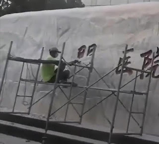 图1:大午医院门前巨石上的“病人进门,医院全责”标语正在被抹除