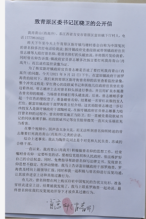 2021年9月24日,本网获悉:一直将 “为人民谋幸福”、“让人民群众在每一个诉讼案件中都能够感受到公平正义”等新时代“初心”当真,从而坚定不移听党话的江西省维权人士肖青山,在新圩镇党和政府的好“奴才”曾志雄对冤民曾名仰实施暴力恶行、并扬言要弄死自己的情况下,向所在的青原区区委书记致公开信,要求管束下面的酷吏,不让这些甘愿“奴才”的小吏,破坏党的“初心”与“使命”。
