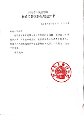 2021年10月29日,本网获悉:今天,河南省人民检察院向宋会春送达《行政监督案件受理通知书》,载明:“申请人宋会春:你不服河南省高级人民法院作出的(2021)豫行再20号行政判决,向本院申请监督。我院经审查认为符合受理条件,根据《人民检察院行政诉讼监督规则(试行)》之规定,决定予以受理。特此通知。”