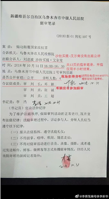 关于庭审人员造假的问题,今天一口咬定“判决书上写的公诉人沙拉买提·艾尔肯参加了,审判长邓颖参加了,一直在法庭,等你回乌鲁木齐市可以去看庭审录相”。以前在电话里给我的解释是“开完庭让你进去看李霖,你看到那个汉族女检察官就叫沙拉买提·艾尔肯,你进去时,邓颖刚出去”。