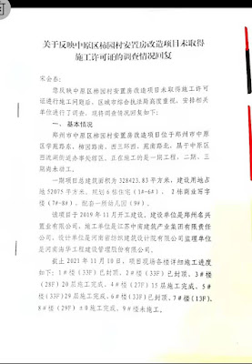 2022年1月18日,本网获悉:2022年1月17日下午,郑州市中原区城市综合执法局向郑州中原区柿园村(宋庄)村民宋会春送达《关于反映中原区柿园村安置房改造项目未取得施工许可证的调查情况回复》(简称《回复》)。
