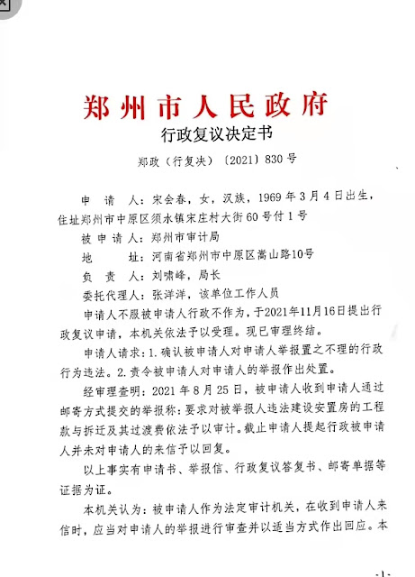 2022年1月19日,本网获悉:2022年1月18日,郑州市中原区宋庄村民宋会春收到郑州市人民政府作出的郑政(行复决)830号行政复议决定书,载明:责令郑州市审计局在30日内对宋会春的申请作出答复。